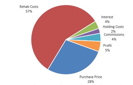 The chart below shows a general split of how it all worked out. Rehab costs ate up 57% of total proceeds, with the purchase price taking up another 28%. Those are our “Hard Costs.” Rehabbers generally have a good sense of how to estimate those. What many newbie flippers forget, however, is that there are soft costs, as well – interest, commissions on the sale, insurance, taxes, lawn maintenance, snow removal, utilities, etc.